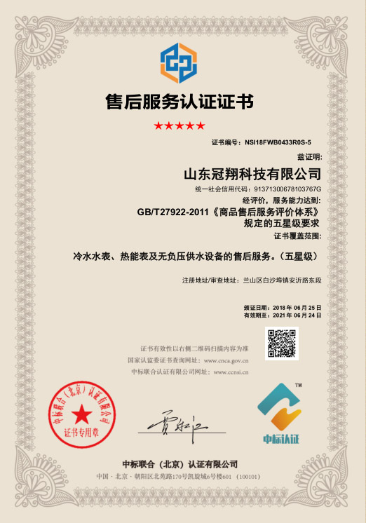 供水設(shè)備五星級售后服務(wù)認(rèn)證證書